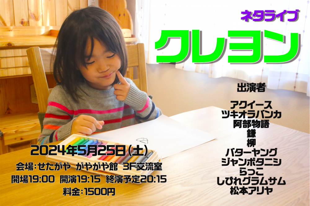 クレヨン(ネタライブ) SCHEDULE 2024/05/25(土) イベントを開催する場所を記入することができます。 クレヨン タイタン周辺の若手芸人が出演するネタライブ 出演者松本アリヤ / 鎌 / アクイース / ツキオラバンカ / 阿部物語 / 柳 / バターヤング / ジャンボタニシ / らっこ / しびれグラムサム 開場19:00 開演19:15 終演予定20:30会場:せたがや がやがや館 3F交流室料金:1500円 〈チケットサイト〉 クレヨン のチケット購入・予約は TIGET から チケットサイト URLをコピーする 報告する